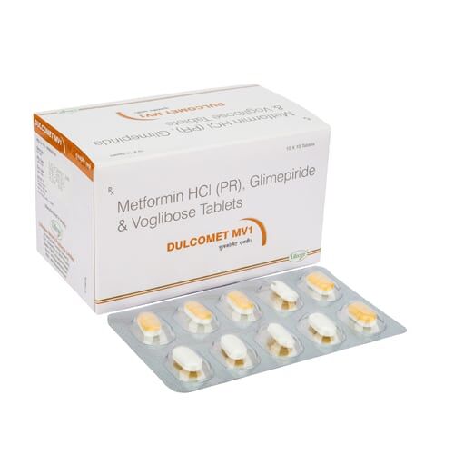 Glimepiride, Metformin & Voglibose Tablet- Dulcomet MV 1 Tablet is a combination of the three drugs, such as Glimepiride, Metformin, and Voglibose, that is used in the treatment of type 2 diabetes mellitus. Glimepiride stimulates the pancreas to release more insulin, which helps with fasting and overall blood glucose levels. Metformin reduces glucose production in the liver and improves the body’s sensitivity to insulin, which helps the cells to use glucose more efficiently. Voglibose slows down the digestion and absorption of carbohydrates in the intestine, which helps in reducing the rise in blood sugar after meals. This combination provides comprehensive glycemic control by targeting insulin secretion, insulin resistance, and post-meal glucose spikes.